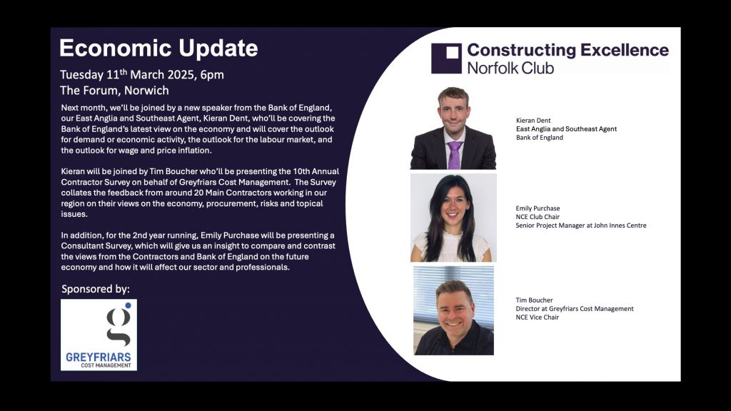 At this event, we were grateful to have been joined by Kieran Dent from the Bank of England, who outlined the latest economic outlook, including demand, labour market, and inflation trends. Additionally, our own Tim Boucher (Vice Chair) presented the 10th Annual Contractor Survey, sharing regional contractors’ views on the economy, procurement, and risks. Emily Purchase (Chair) then offered the Consultant Survey, providing insights to compare contractor perspectives with the Bank’s outlook and their impact on the sector.
